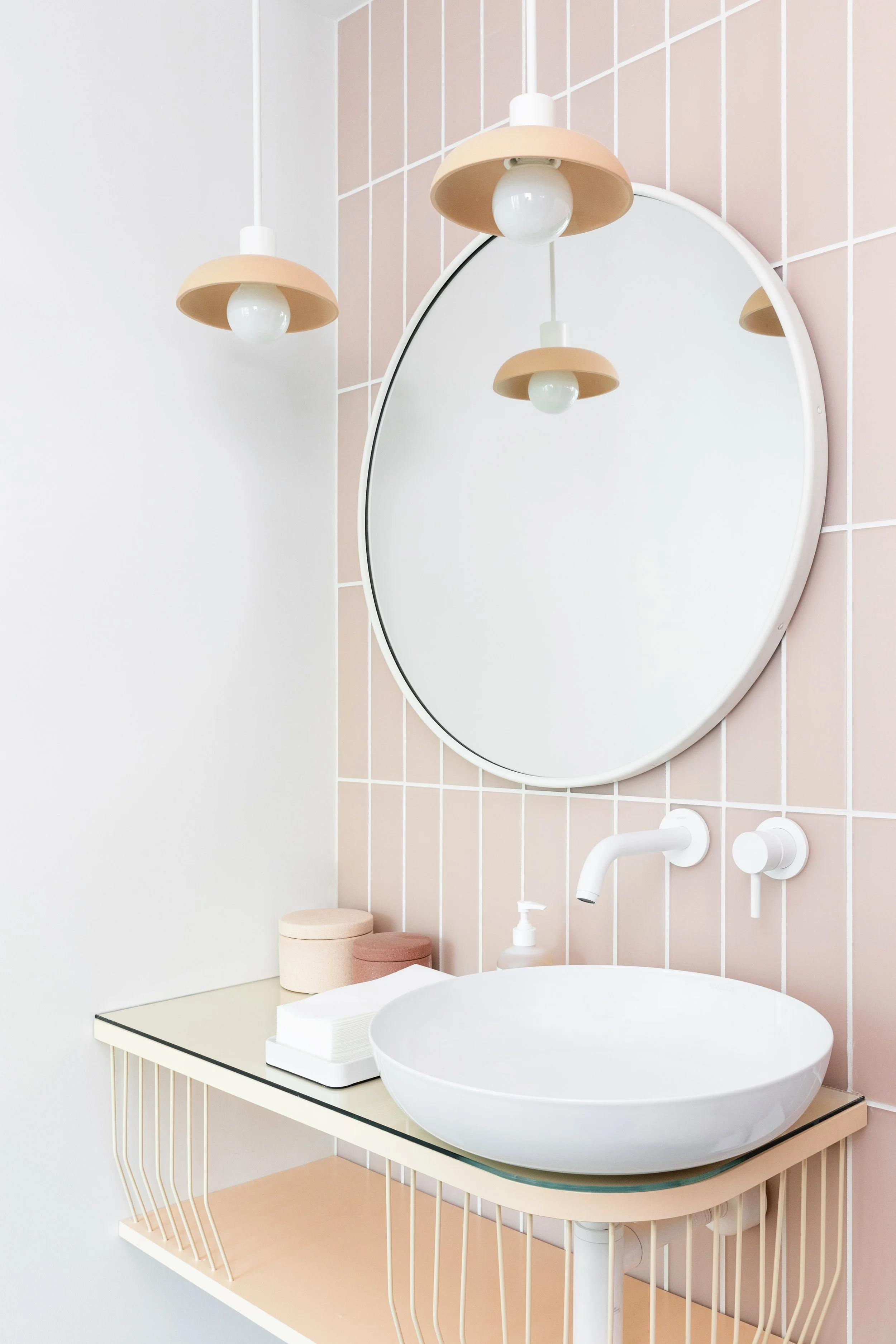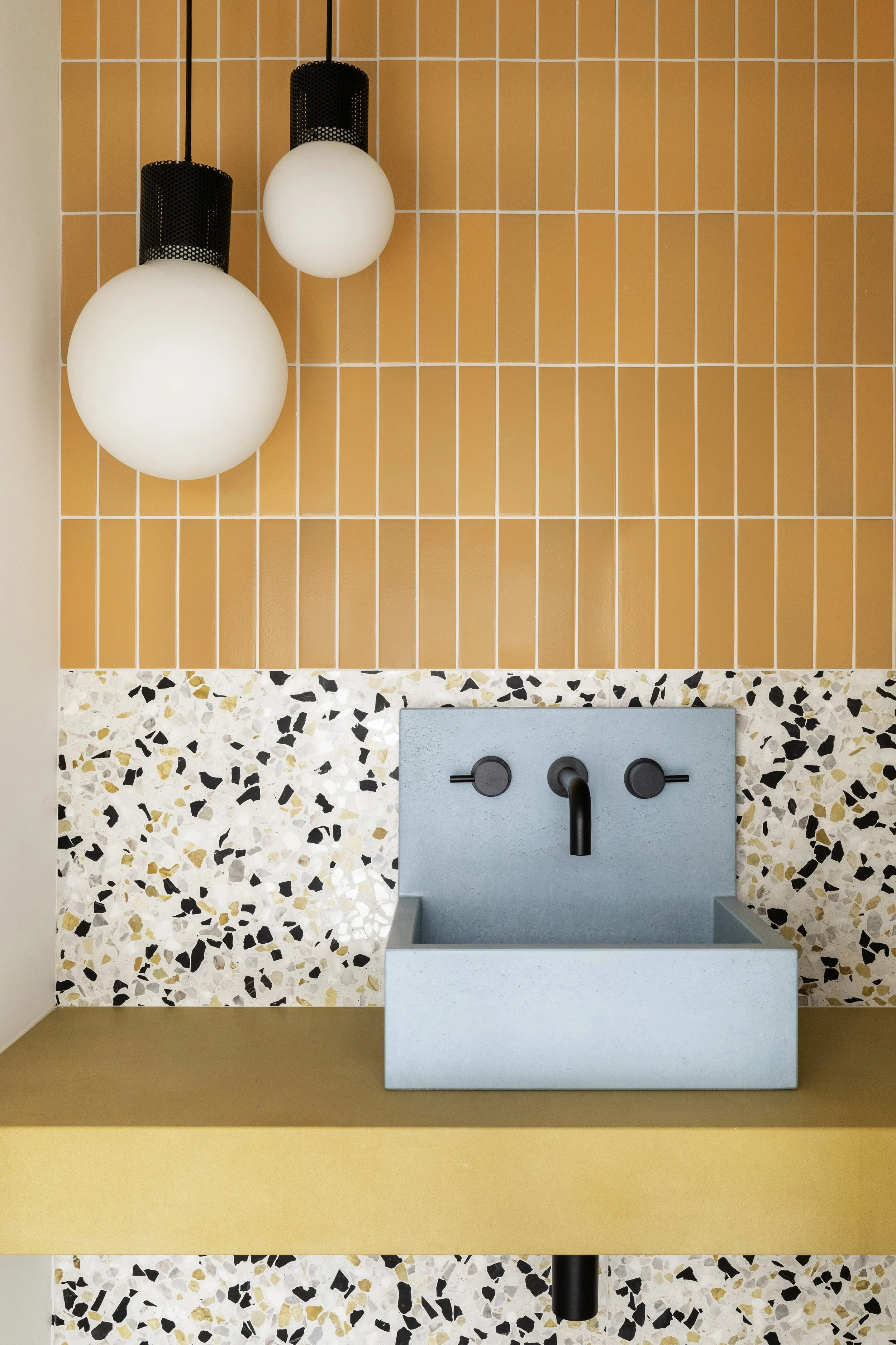 The downstairs powder room is clad in an orange sorbet tile, with a baby blue sink set against a bold terrazzo half-wall.