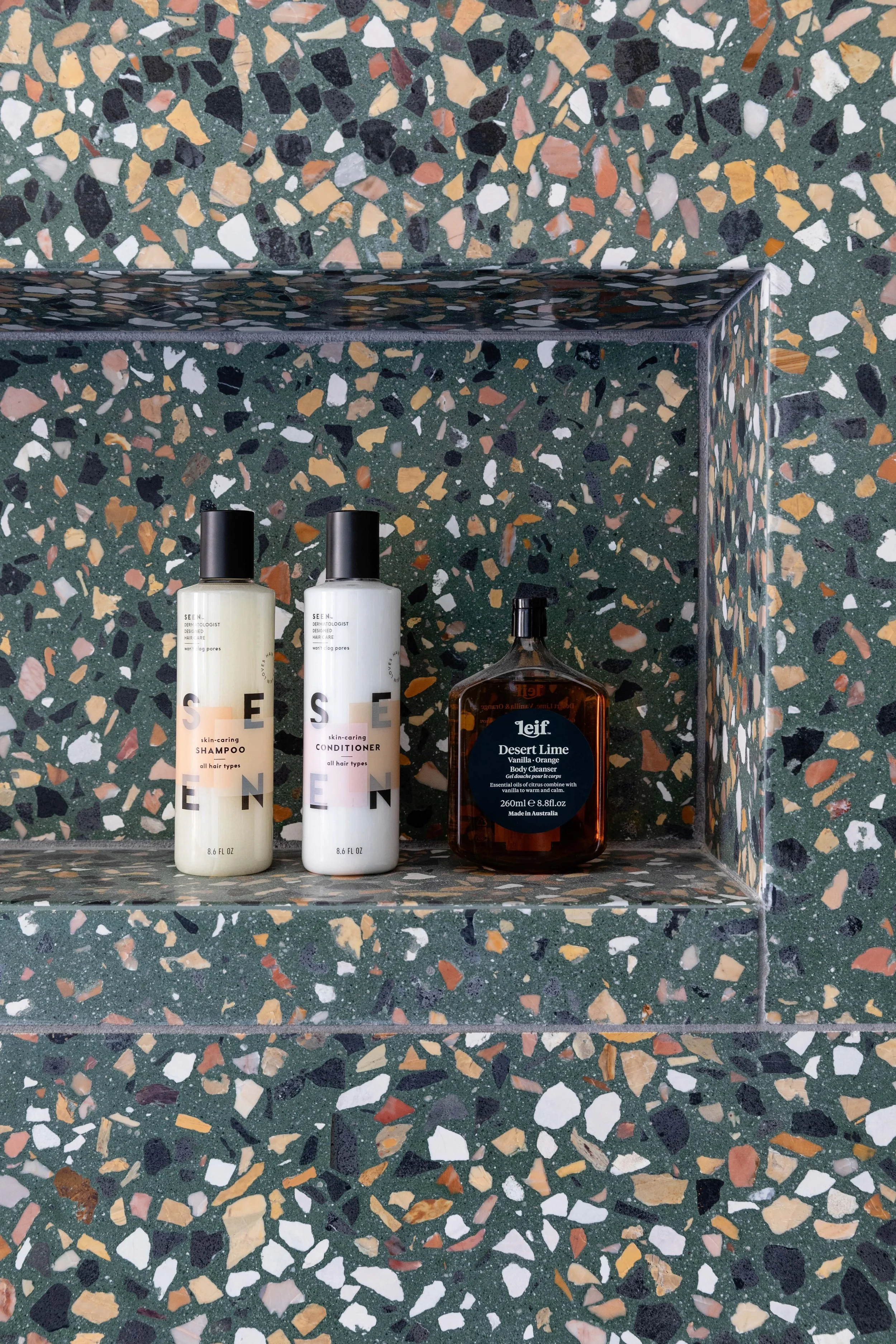 Although more subdued, even the shower sports a dark terrazzo with a sleek, recessed nook to place your shower accessories.
