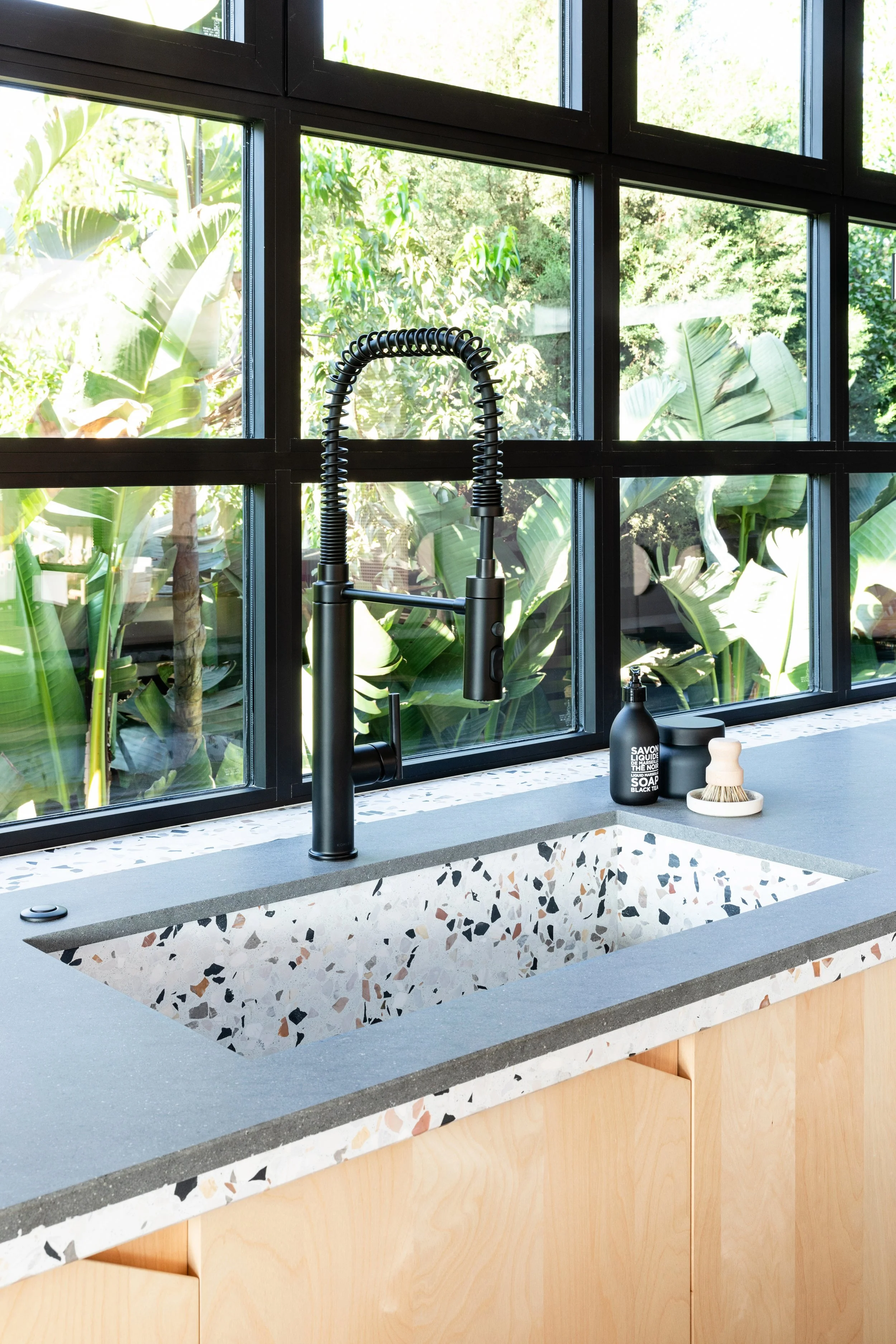 Plywood cabinets carved with triangular pulls in lieu of hardware, double-stacked with lava stone countertops, and a custom-fabricated terrazzo sink.