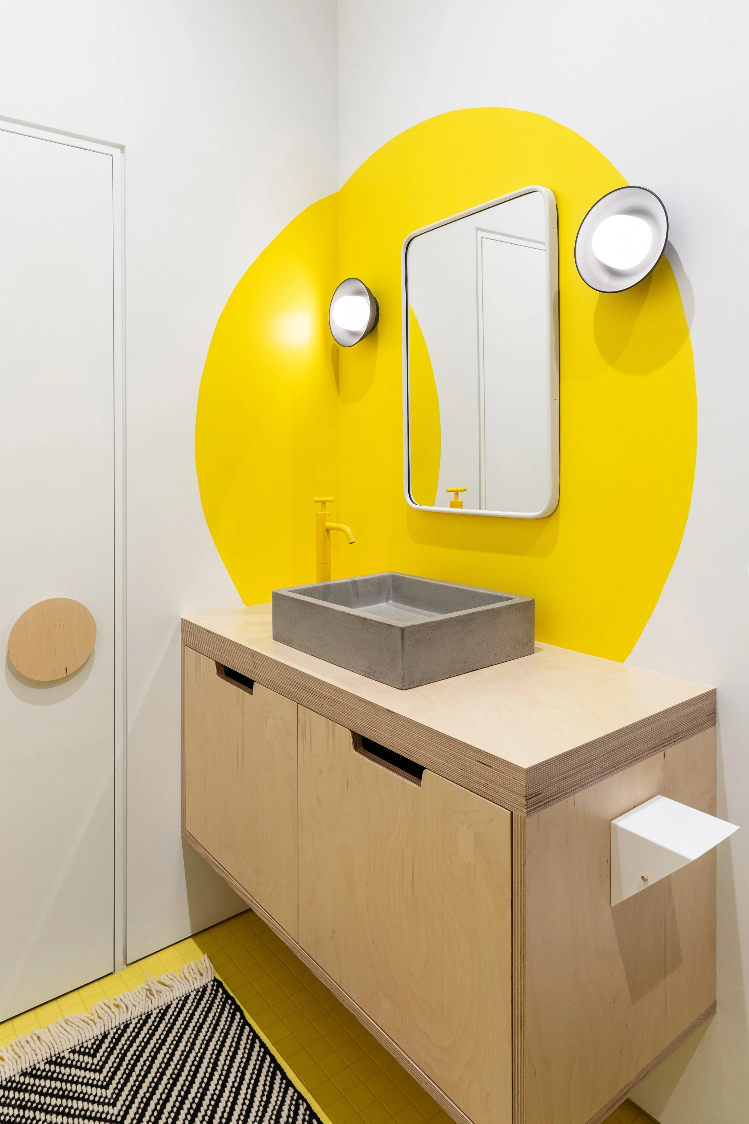 The kids’ bathroom boasts a vibrant yellow floor, matching yellow faucets, and a custom concrete tub and sink along with black wall tile.